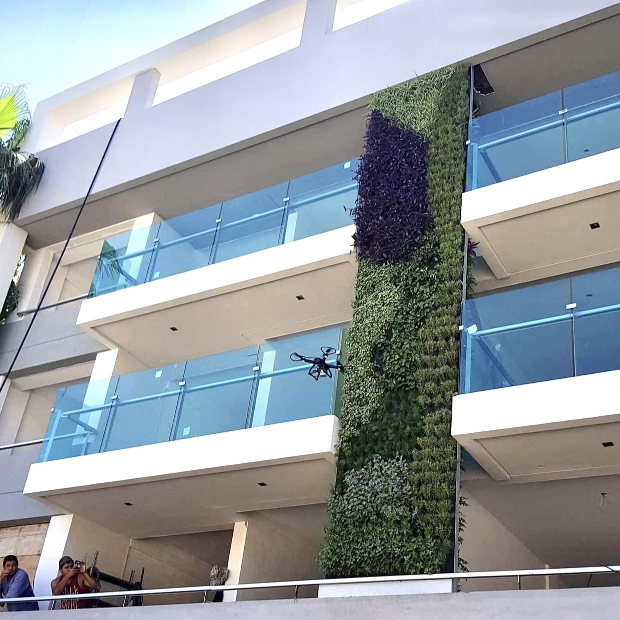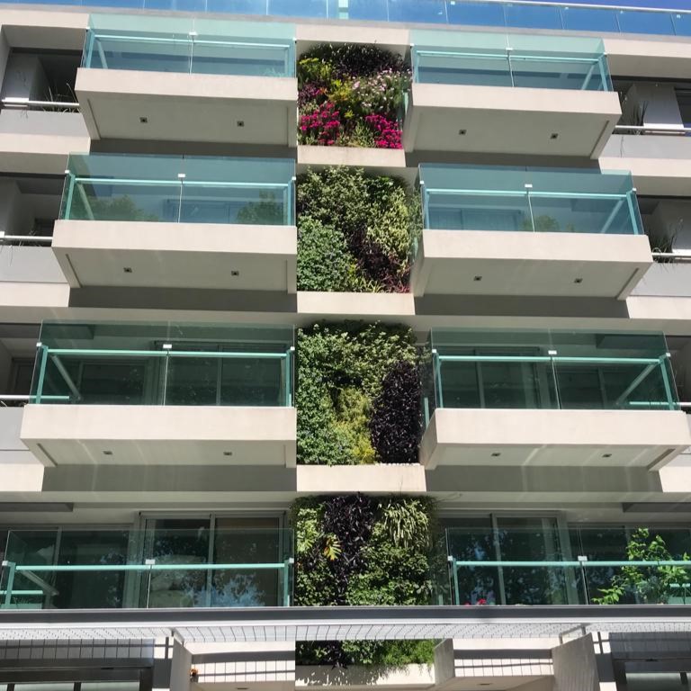 Desarrollamos e instalamos cuatro jardines verticales ubicados en el frente y en el contrafrente del edificio. En ambos sectores se montó una estructura con caño estructural de aluminio soldado para que en ambas caras se instale un jardín vertical. De esta manera se logró que los habitantes puedan apreciar la maravilla de la naturaleza tanto desde el interior de sus departamentos como del exterior.