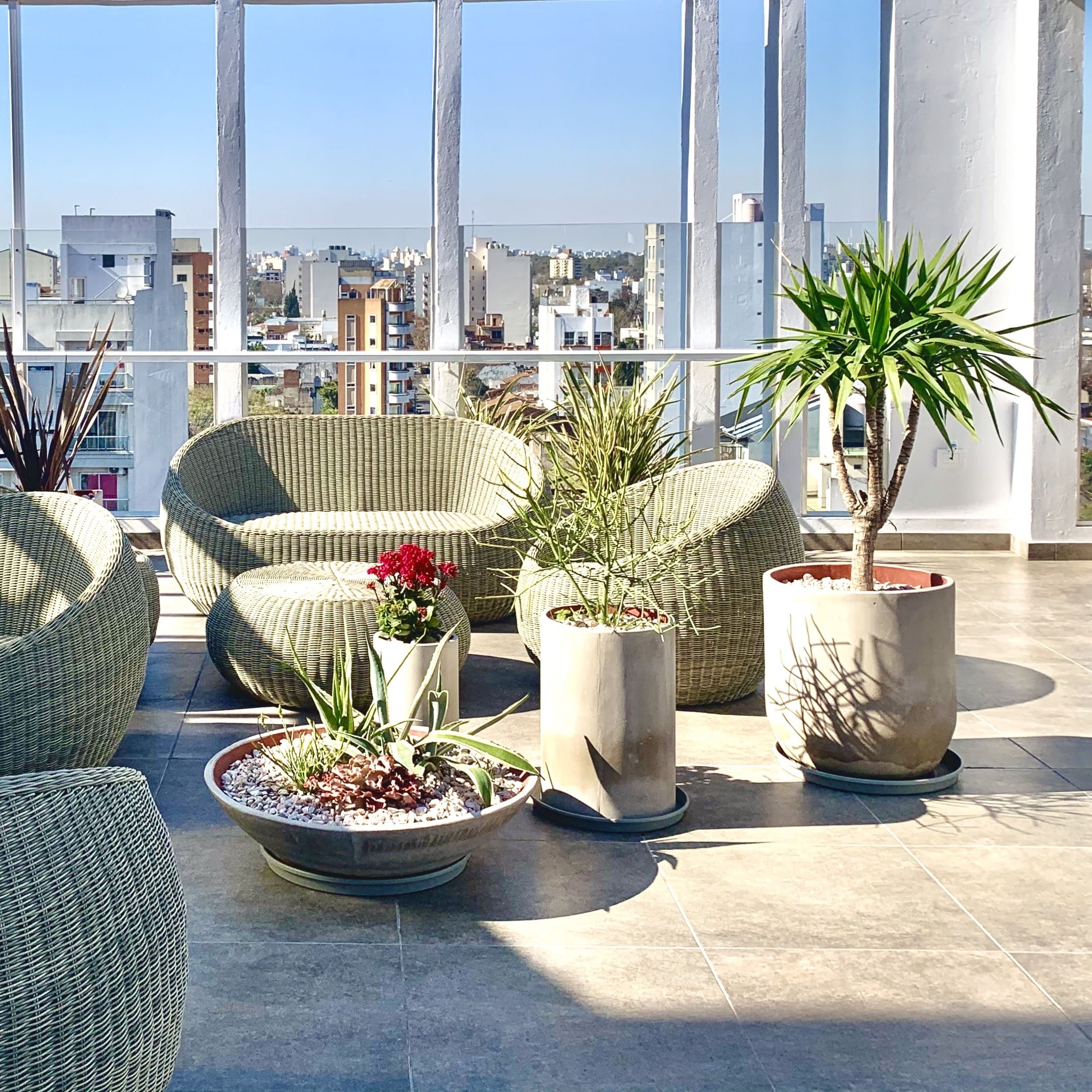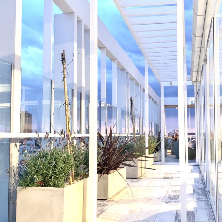 Nuestro cliente Spazios constructora, una de las desarrolladoras más importantes de Buenos Aires, nos encomendó la ambientación de los espacios comunes y la del edificio, donde la piscina ocupa el lugar central. Plantamos diversidad de especies, en macetas de diferentes diseños entre las que se destacan las lavandas, que aportan además perfume a toda el área.