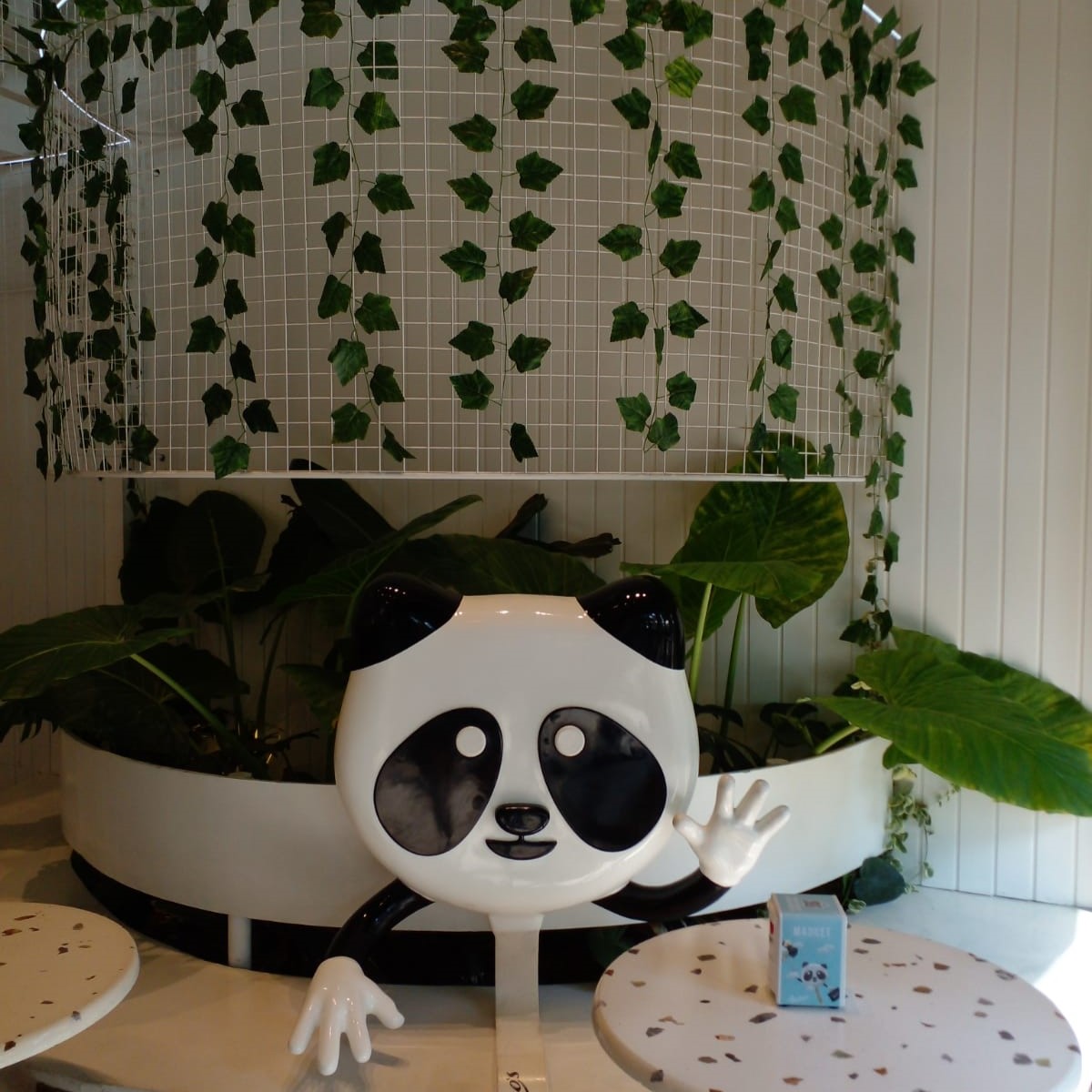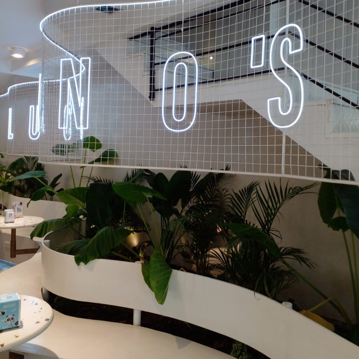 En esta obra realizamos el desarrollo integral de los espacios verdes del local. El estudio de arquitectura nos encomendó plantar strelitzias, alocasias, monsteras, y plantas colgantes y trepadoras para cubrir el enrejado superior. También instalamos un sistema de riego y fertilización automáticos. Al mismo tiempo, y a efectos de aportar verde desde su apertura, instalamos de manera transitoria plantas colgantes artificiales.