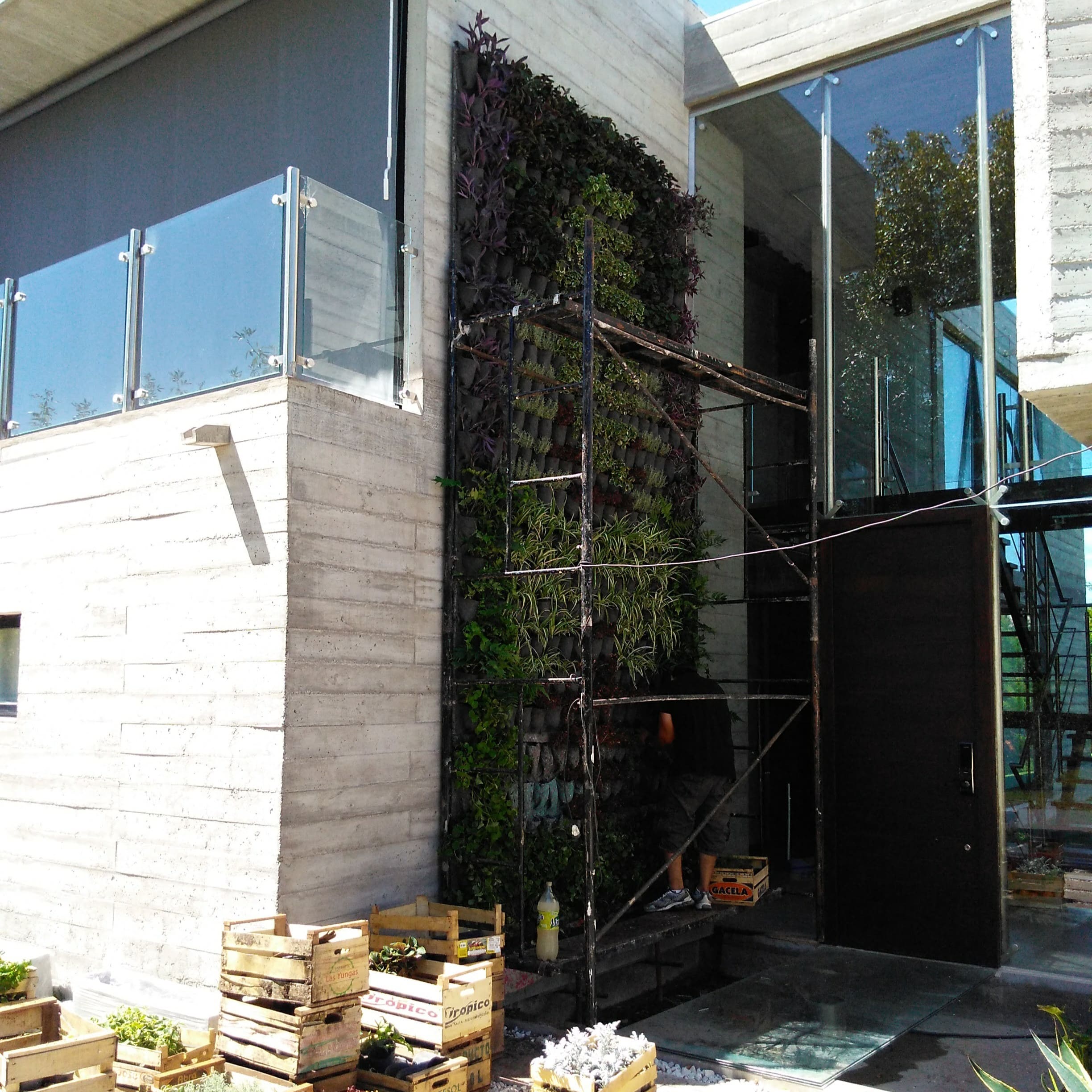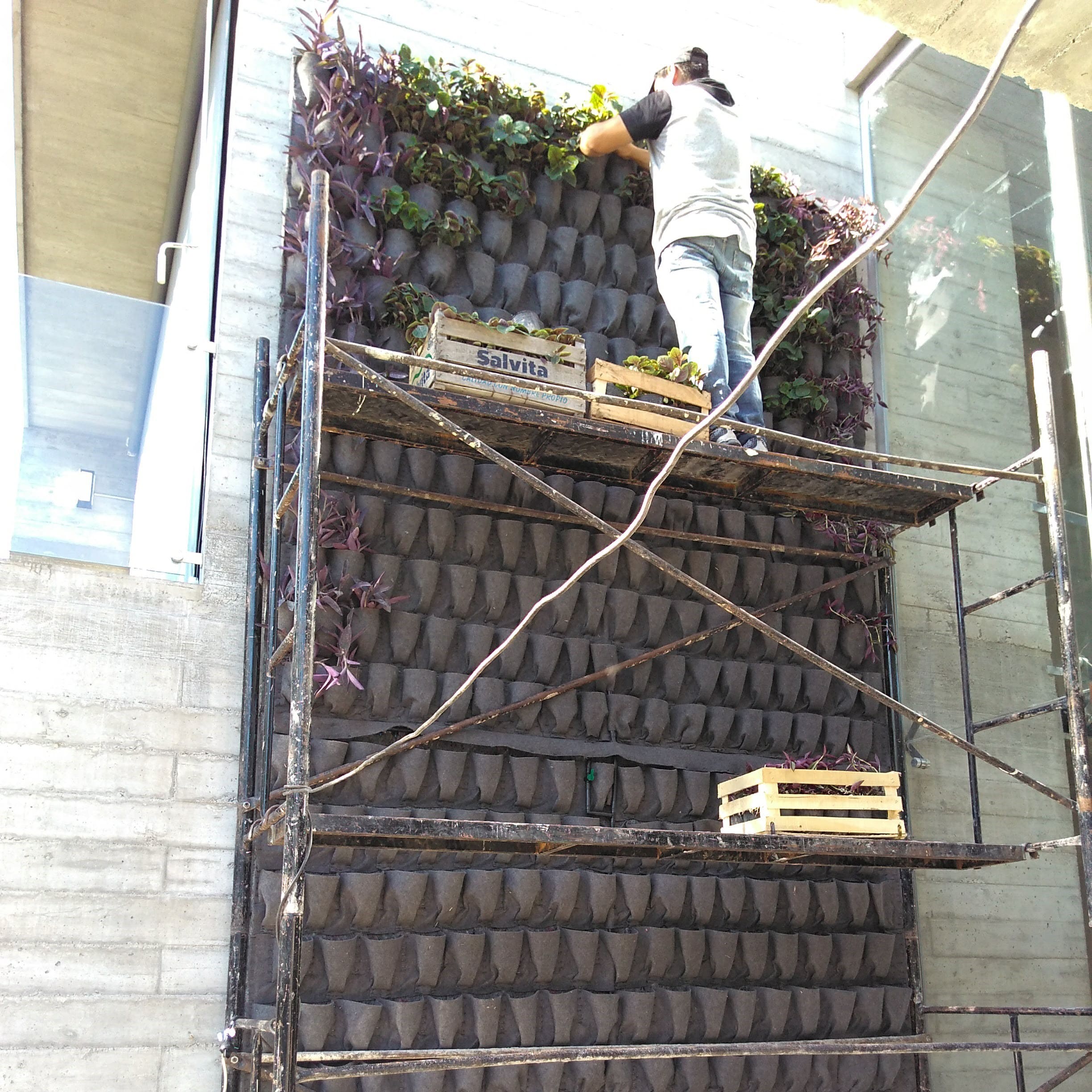 Luego de acordar con el propietario las especies a plantar, y el diseño, desarrollamos el jardín vertical con sistema de riego y fertilización automático con bomba sumergida, ubicada en la batea colocada en la base del jardín.