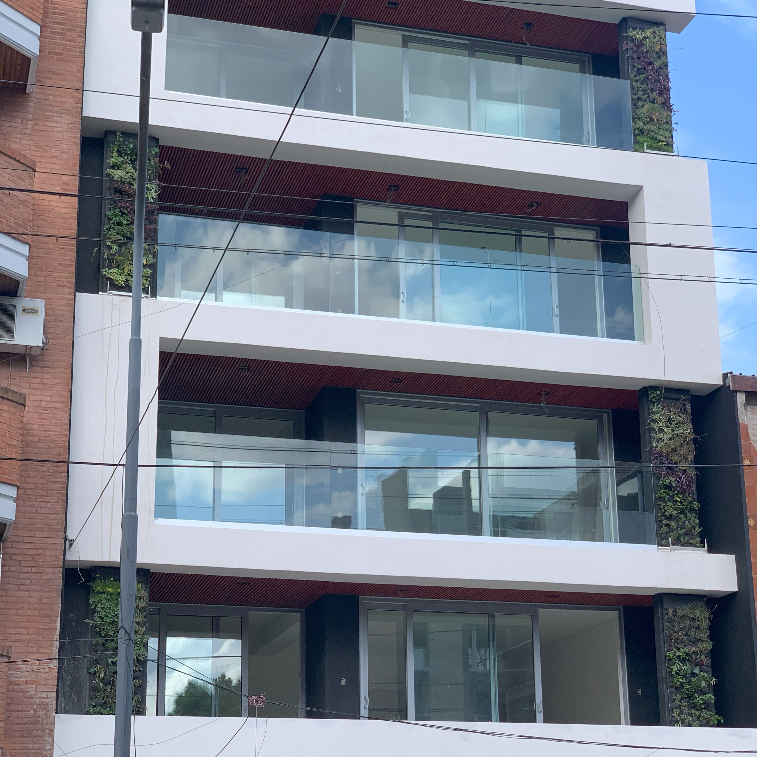 En esta obra el estudio de arquitectura Ciocale nos encomendó montar en la fachada, en la terraza y en el hall de ingreso jardines verticales para combinar el estilo moderno del edificio con la naturaleza. Debido a que trabajamos desde el inicio de la obra, se pudo instalar el sistema de riego y fertilización en el interior del edificio, y distribuir desde allí las cañerías para regar y fertilizar cada uno de los muros verdes instalados.