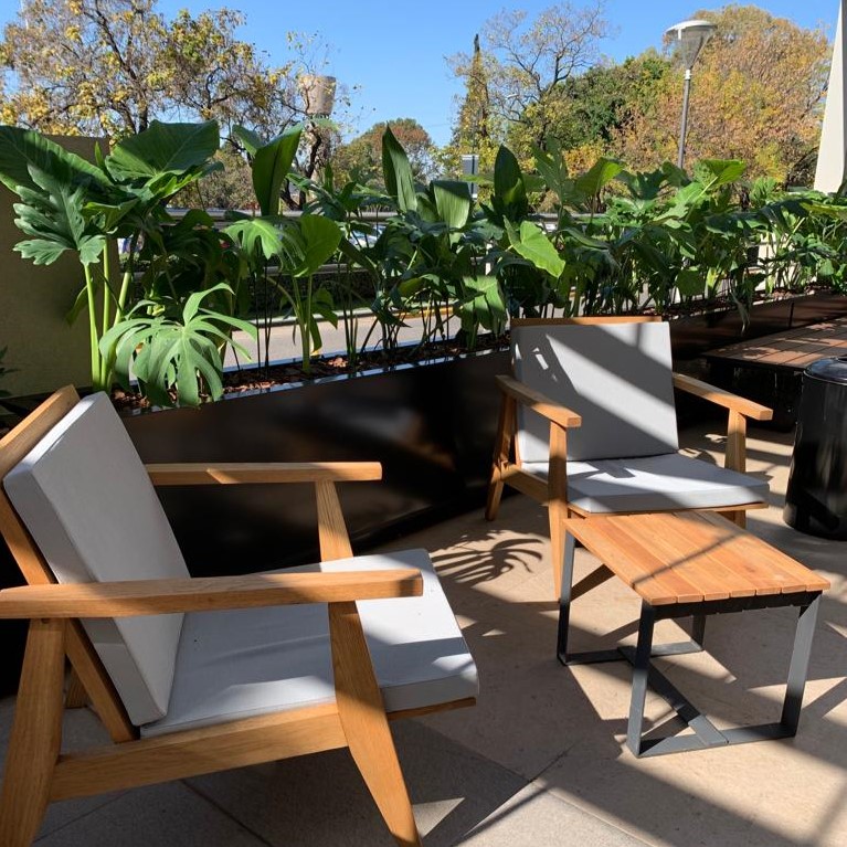 Esto se logró incorporando canteros con plantas de hojas anchas, macetas con plantas y 2 árboles cuyas copas superarán la altura de la pérrgola.
