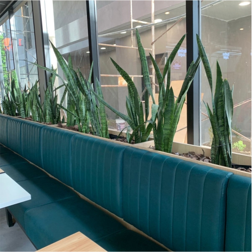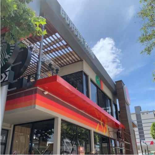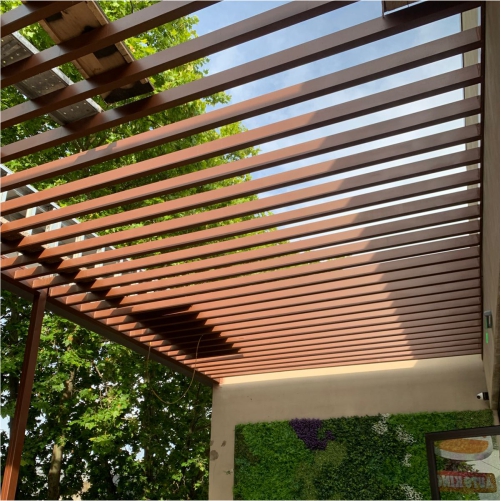 En esta ocasión transformamos la terraza de la tienda, montamos una pergola metálica y realizamos el diseño e instalación de un jardín vertical artificial. Tambien realizamos el paisajismo, colocamos plantas en los canteros interiores y exteriores de la tienda.